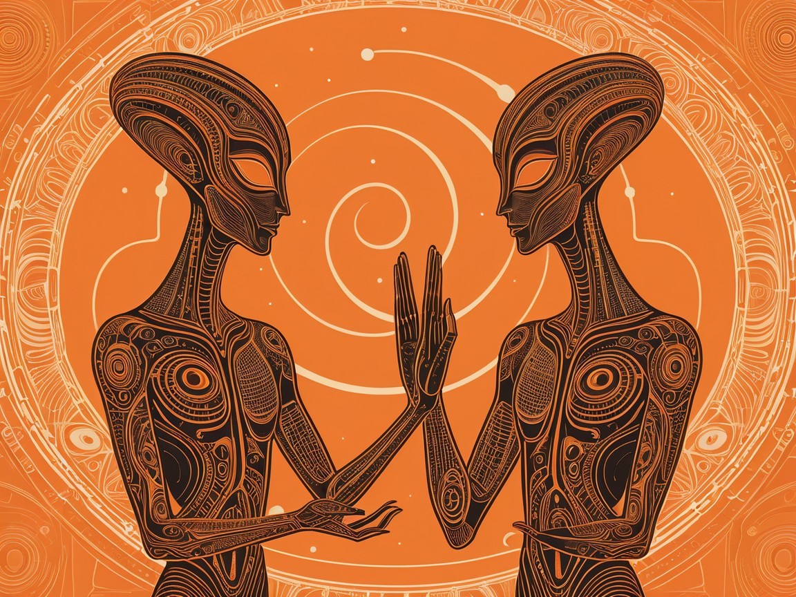 The illustration features two elongated alien figures in orange tones, touching hands in a gesture of communication. Their large, oval heads with single eyes and intricate symbols create a surreal, mystical atmosphere.