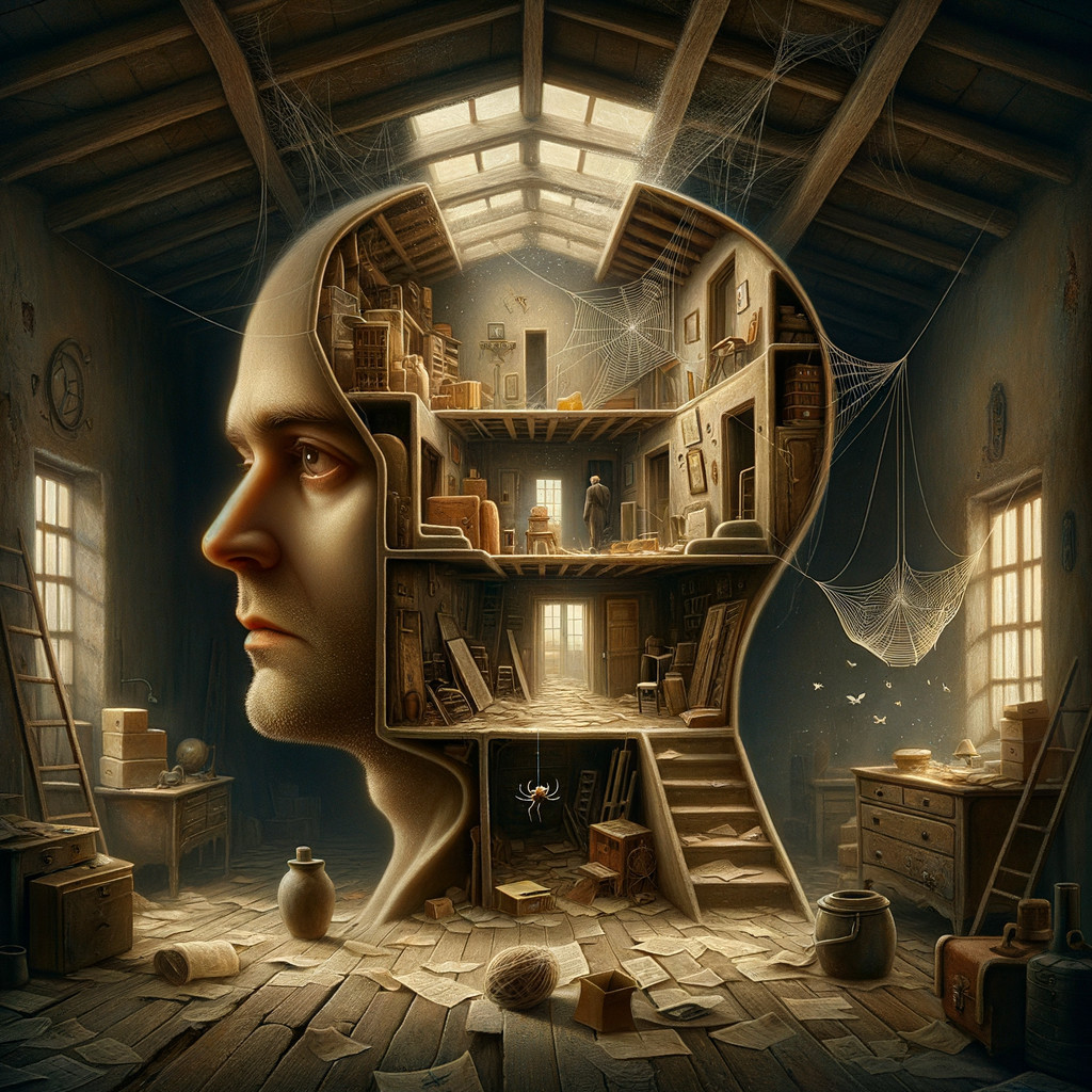 Prompt: "In the surreal realm of a man's cross-sectioned head, unveil a dimly lit, cluttered attic, dust-filled air, cobwebs intricately woven, forgotten objects strewn around, old papers scattered, a solitary spider suspended mid-air, swaying gently, the eerie stillness palpable, a musty and abandoned atmosphere prevailing, evoking deep contemplation lost in time, eccentricity, and quiet madness. The man's expressionless face gazes ahead, seemingly oblivious to the chaos within. Man seen from the front. Embrace the essence of Magritte's style with dreamlike elements, juxtaposing reality and imagination, surrealism, mystery, and introspection. Incorporate muted tones of grey, brown, and sepia, soft shadows to enhance the enigmatic ambiance, intricate details highlighting the clutter, and an otherworldly lighting casting eerie shadows."