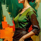 A stylish woman poses in a vibrant, geometric-patterned dress, set against a colorful abstract background. Her confident expression and sleek hairstyle enhance the modern aesthetic.