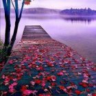 A serene wooden dock extends over a calm lake, adorned with vibrant autumn leaves in shades of red and yellow. Surrounding trees reflect their colorful foliage in the tranquil water.
