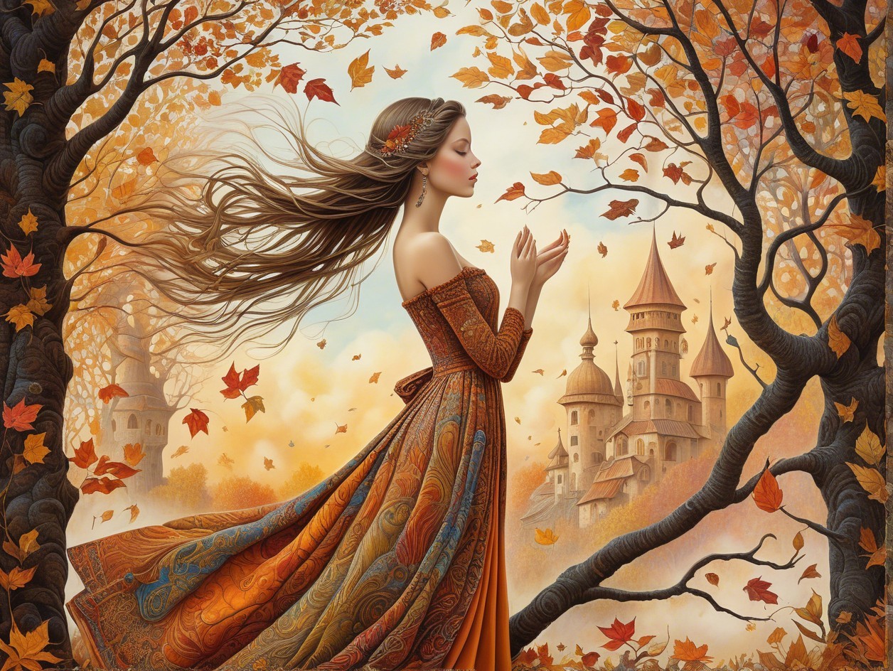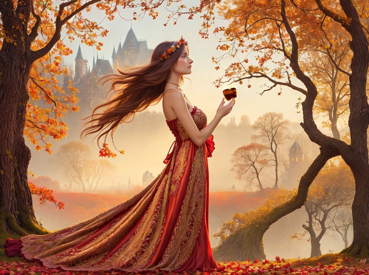 A serene figure in a flowing red gown holds an red, sweet apple, surrounded by vibrant autumn trees and falling leaves, with a distant castle emerging in a dreamy landscape.