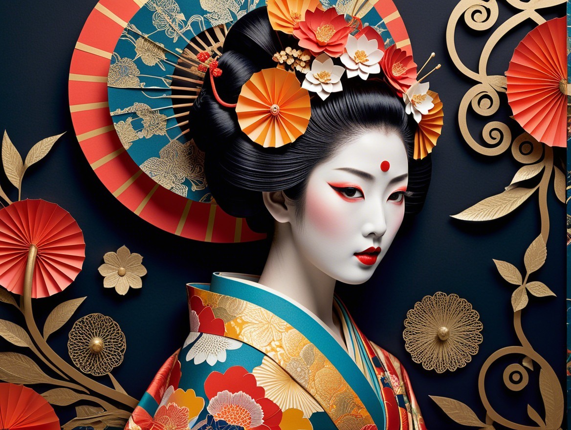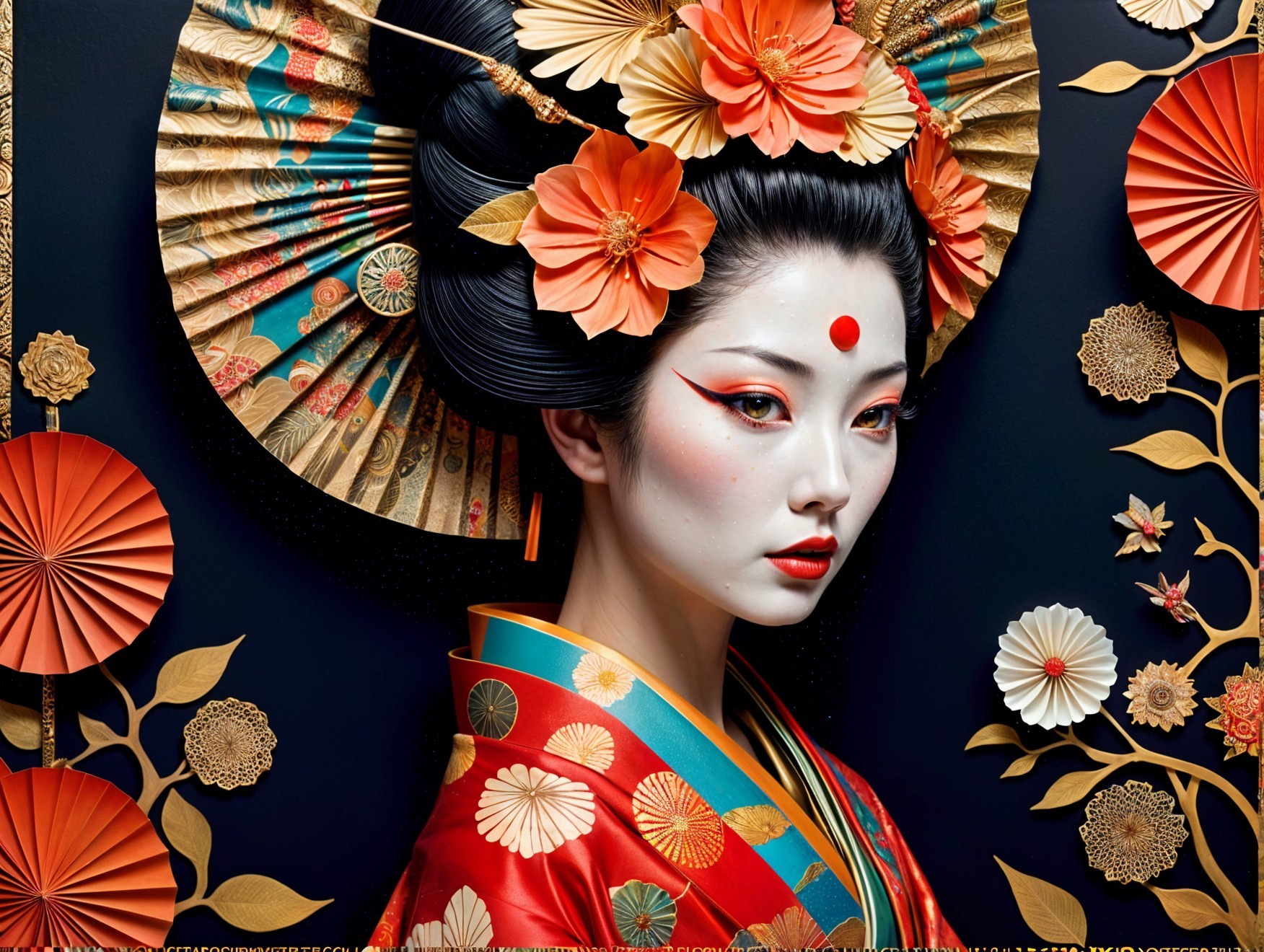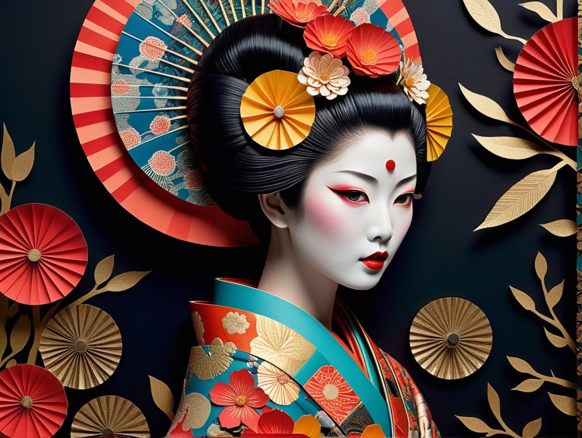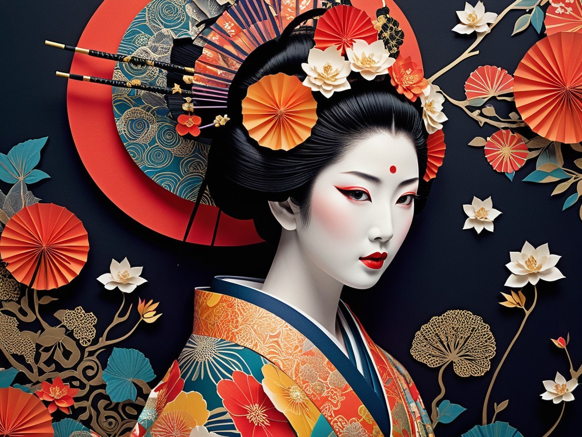 A striking portrait of a woman in traditional Japanese attire, adorned with vibrant flowers and a decorative fan. Her pale skin contrasts beautifully with bold colors and intricate details.