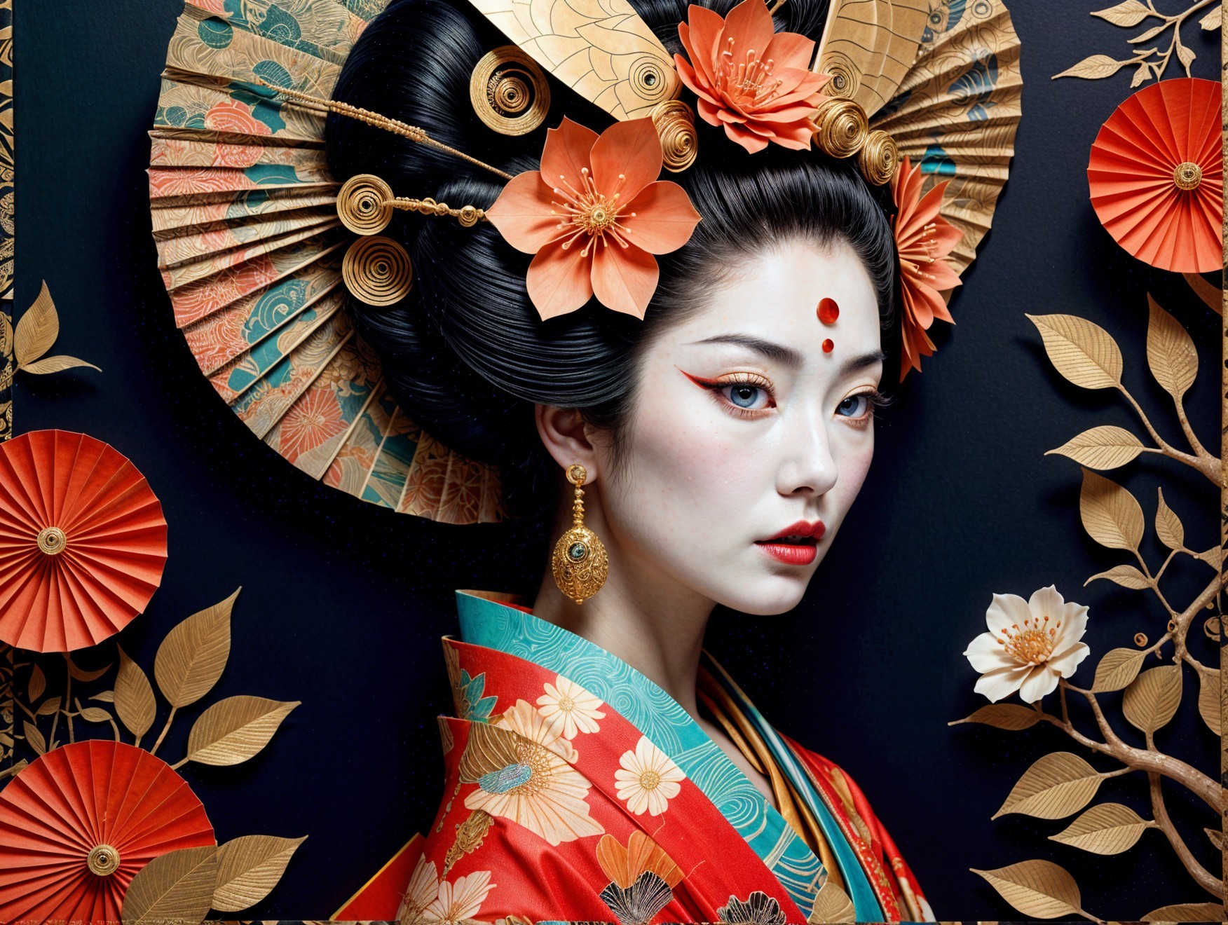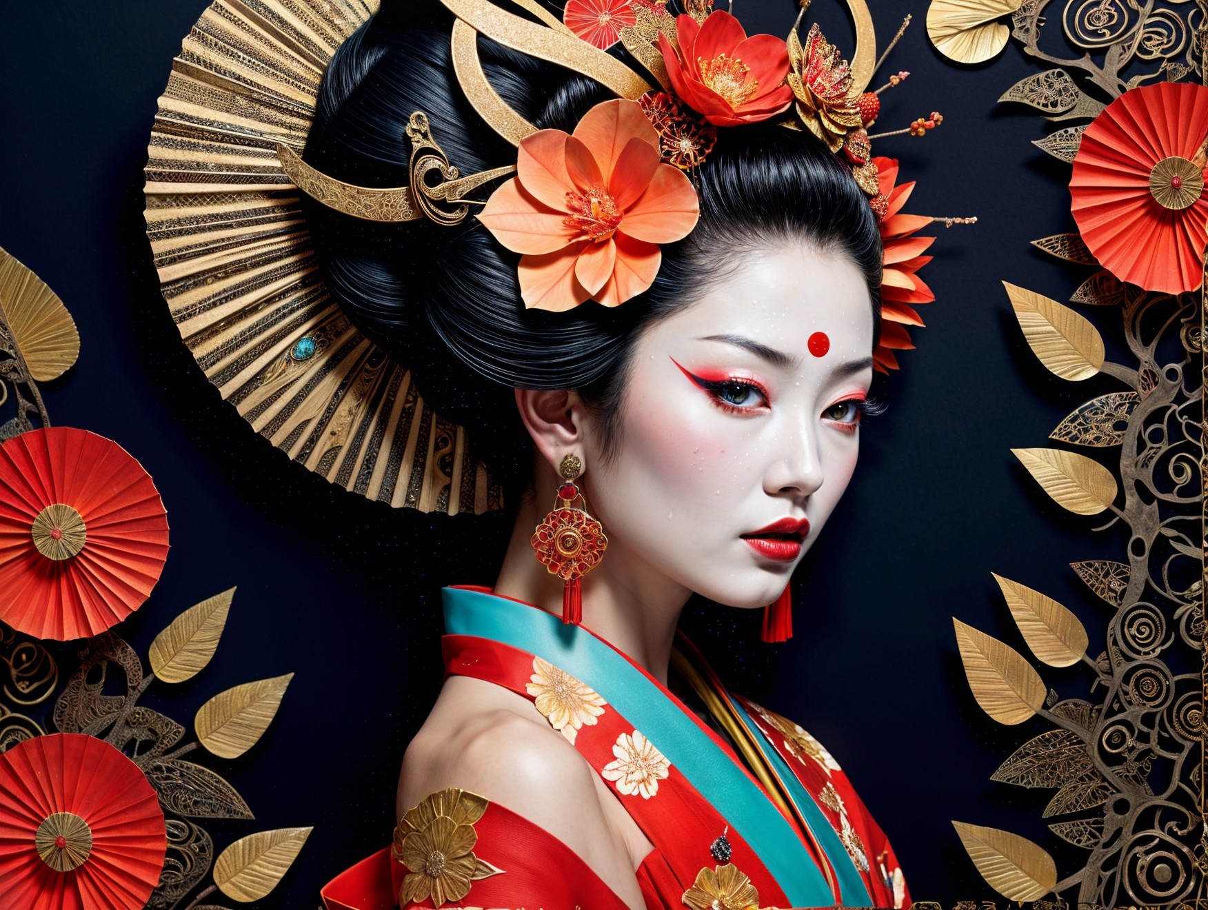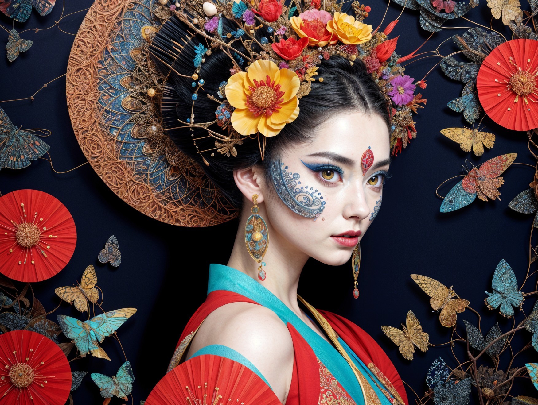 A striking portrait of a woman in traditional Japanese attire, adorned with vibrant flowers and a decorative fan. Her pale skin contrasts beautifully with bold colors and intricate details.