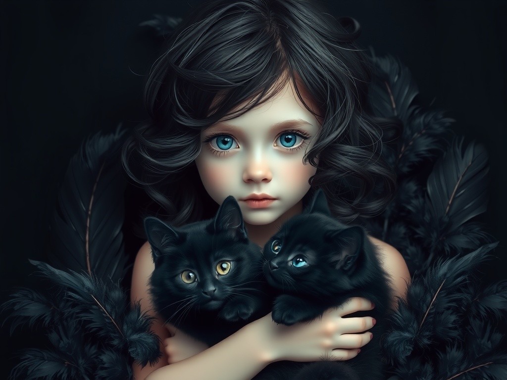 A young girl with pale skin and delicate features sits surrounded by dark feathers. Her wavy black hair frames her face, and her pale blue eyes reflect introspection. She cradles two fluffy black cats, creating a moody, enchanting scene.