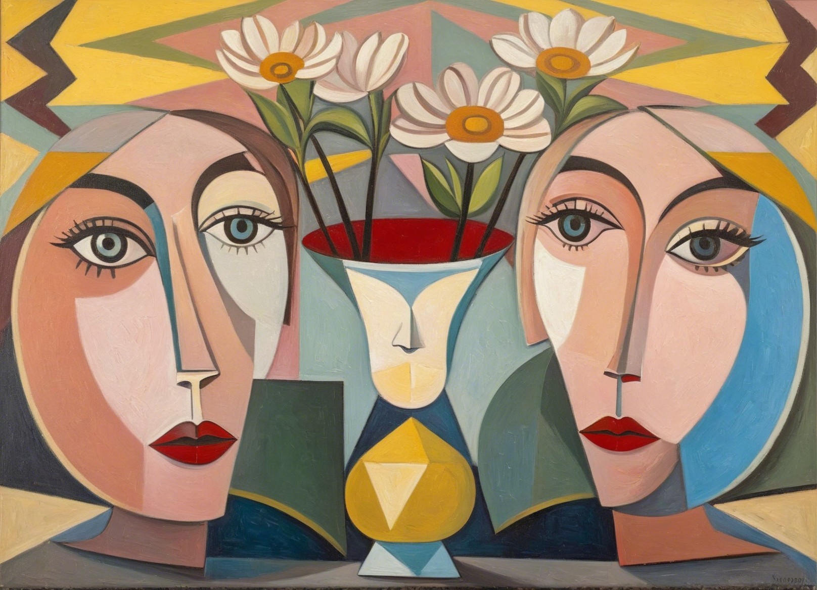 Cubist-style painting featuring two faces with a vase of flowers between them, using geometric shapes and bold colors.