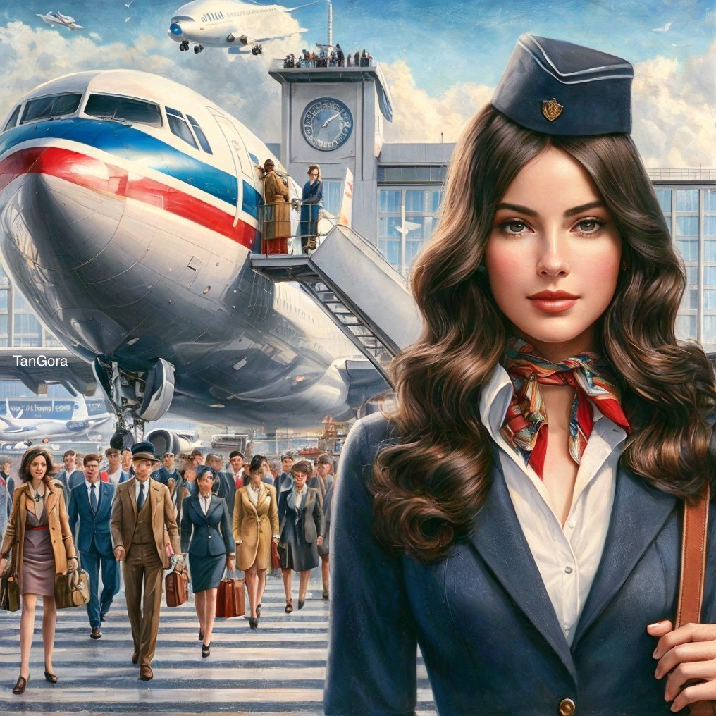 Flight Attendant with Airplane at Busy Airport Terminal