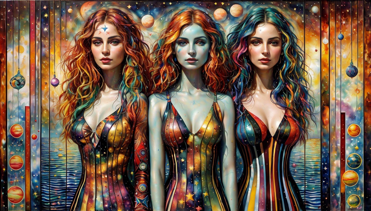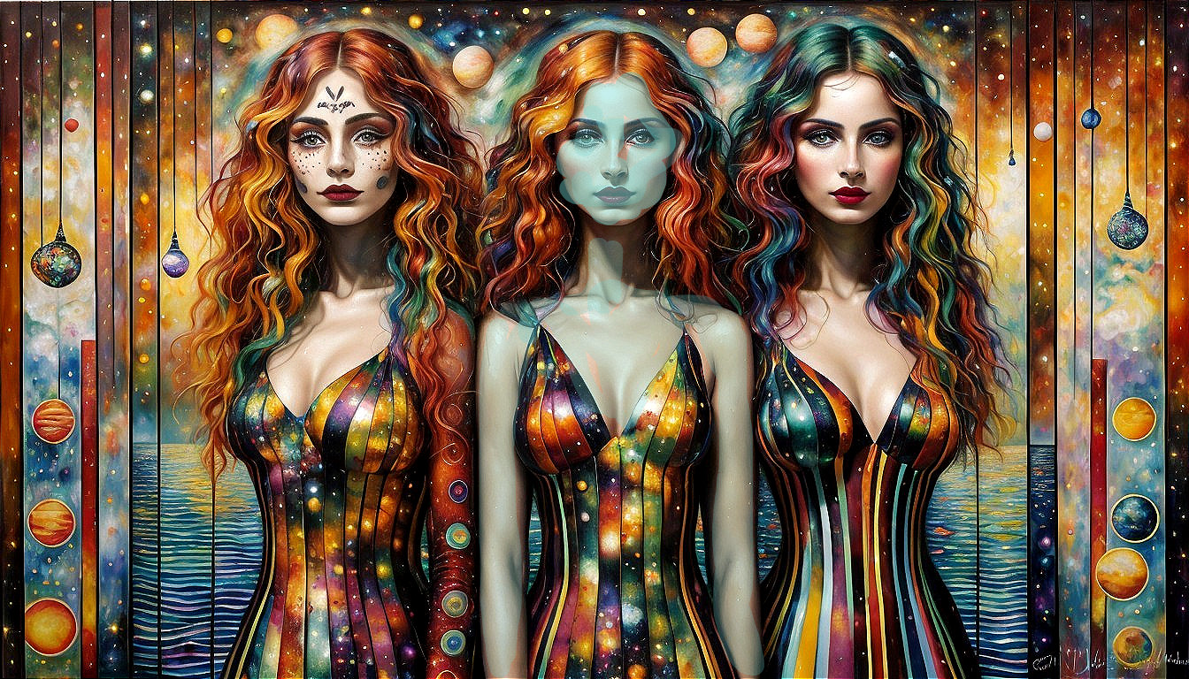 Three women with galaxy-inspired art, vibrant colors, and celestial motifs against a cosmic background.