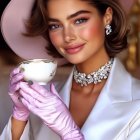 A stylish woman with wavy hair and a pink hat elegantly poses at a table adorned with a cup and colorful macarons, showcasing her chic outfit and sparkling necklace.