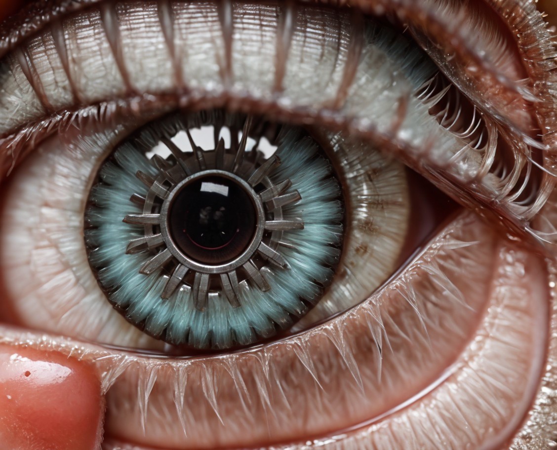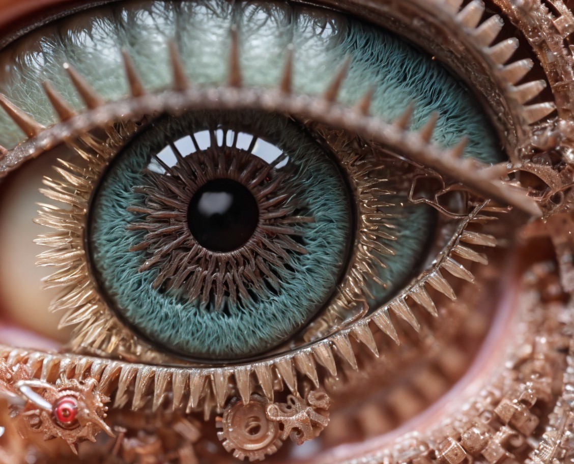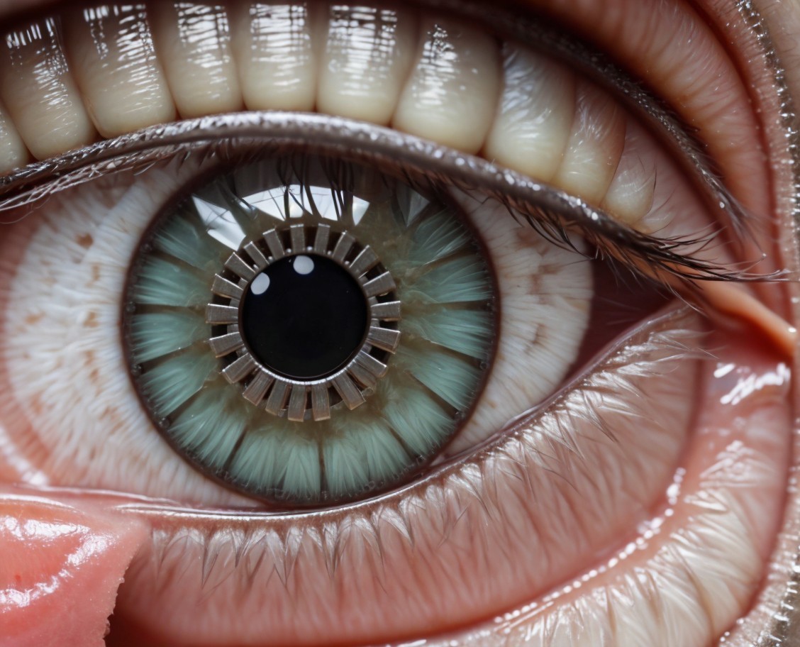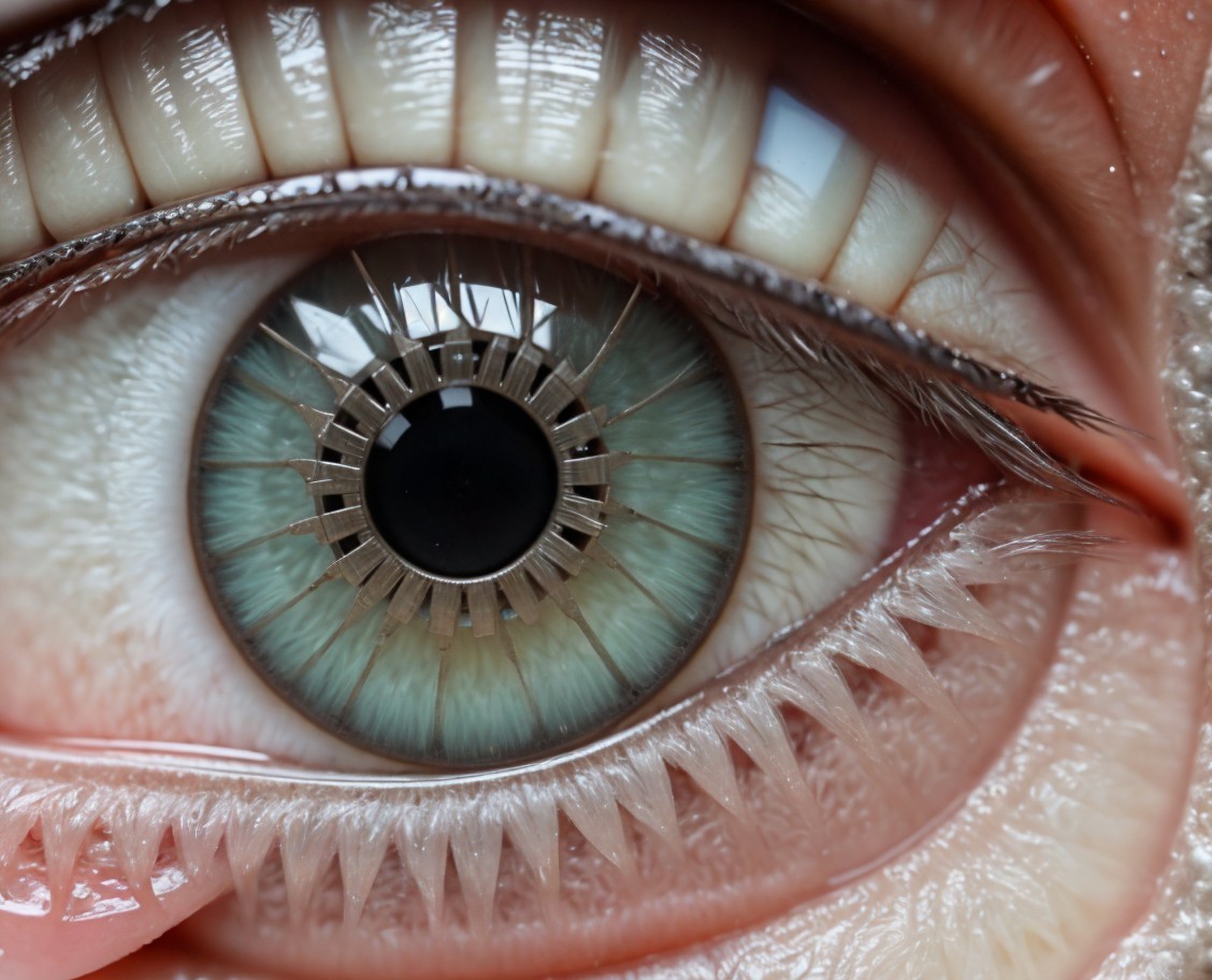 Close-up of a mechanical iris diaphragm, resembling a human eye, with intricate patterns and a central aperture.
