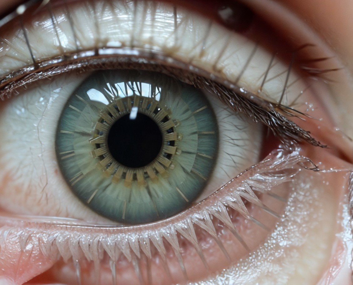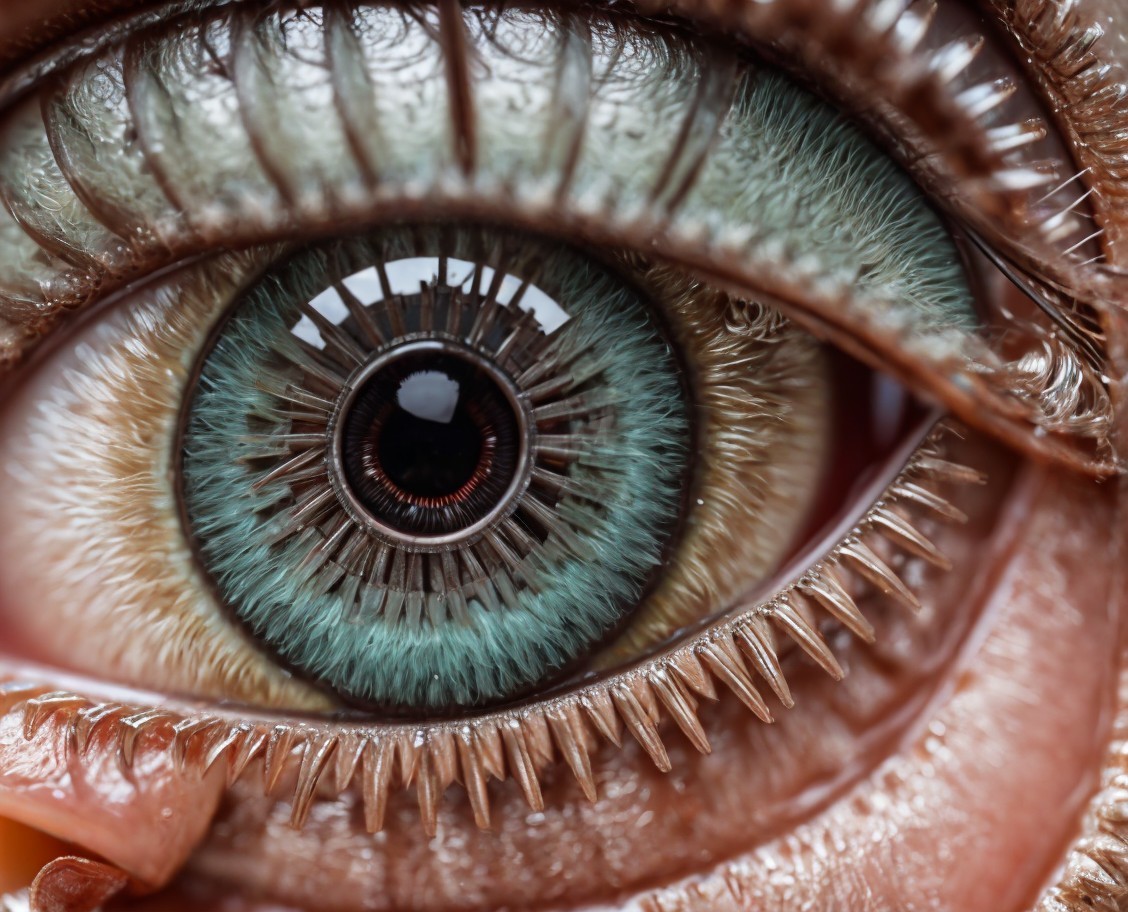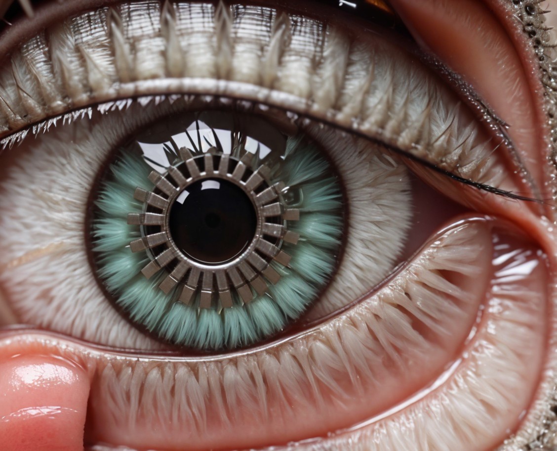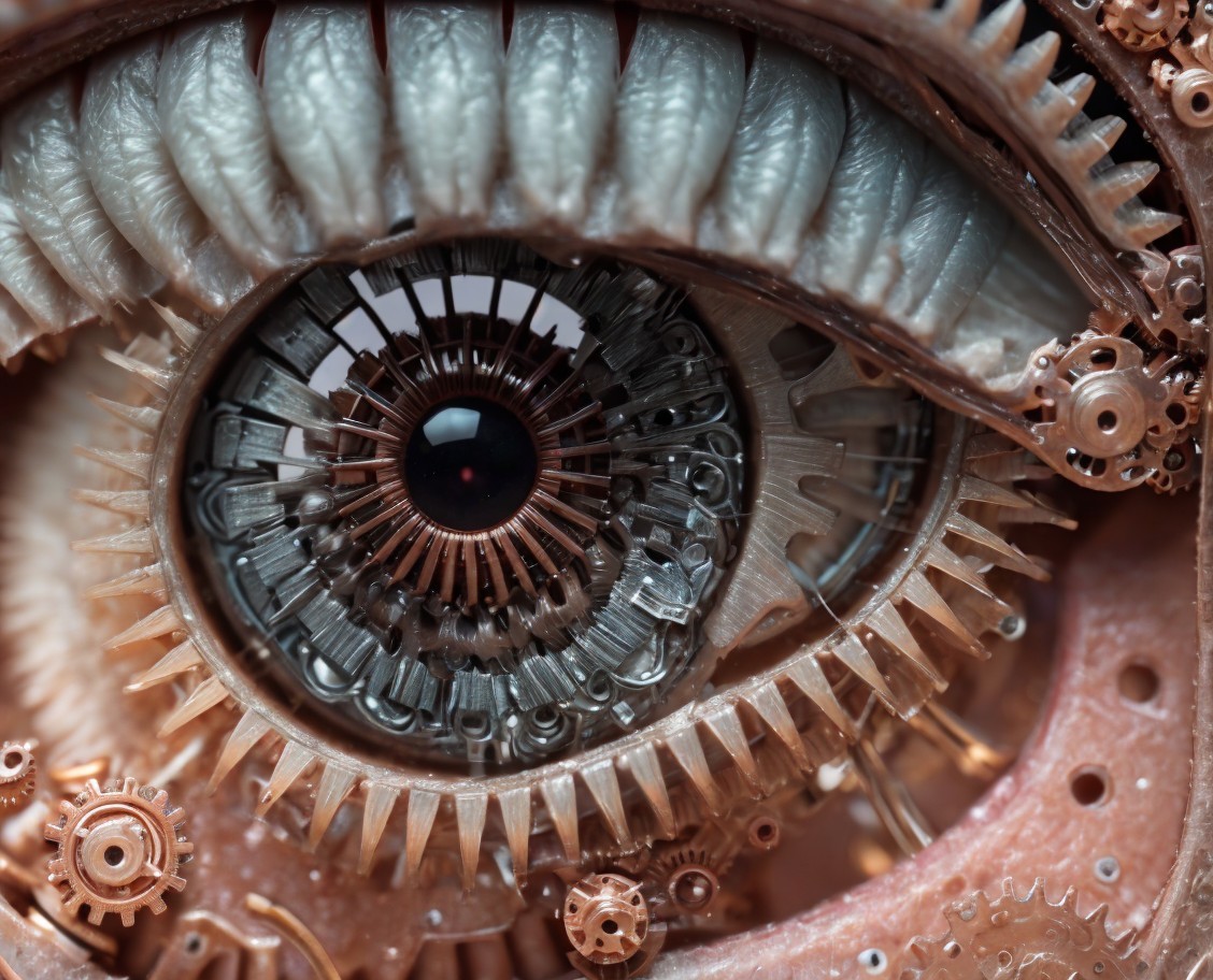 Close-up of a mechanical iris diaphragm, resembling a human eye, with intricate patterns and a central aperture.
