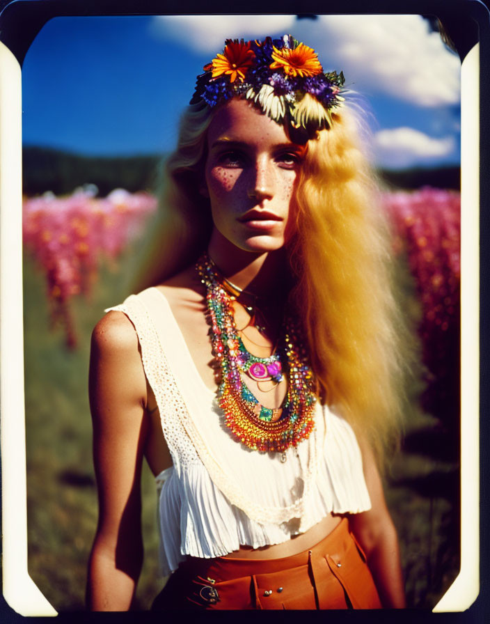 Prompt: "analog style, (polaroid photo), full body, of 1960s (25 year old) female hippie, messy blond hair, [freckles], detailed skin, (wearing vintage psychedelic skirt, barefoot with ankle bracelets, flower headwear), (at Woodstock 1969), slim physique, pretty face, alluring eyes, carefree attitude, natural lighting, film grain, photographed on a SX-70 One-Step, 103mm lens, f/14.6 aperture, surreal collage"