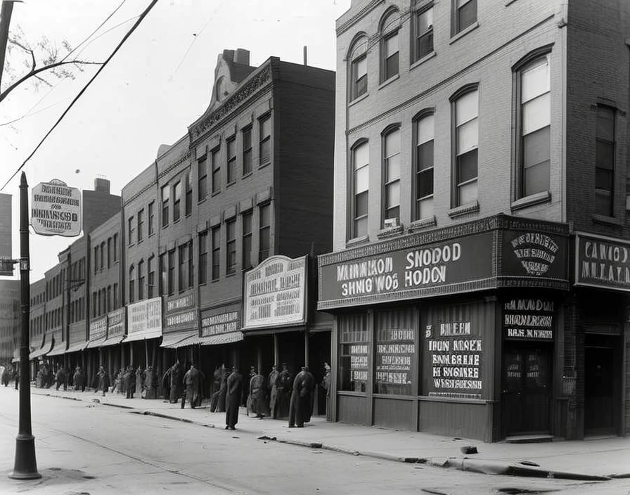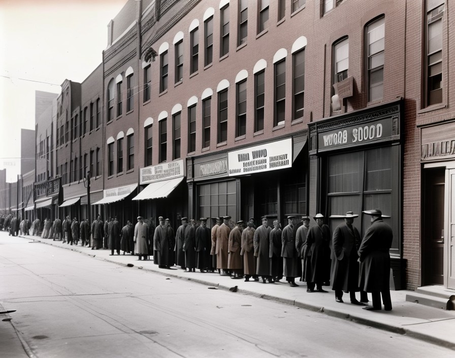 A vintage photo of a long line of men in hats and coats waiting outside buildings on a city street.