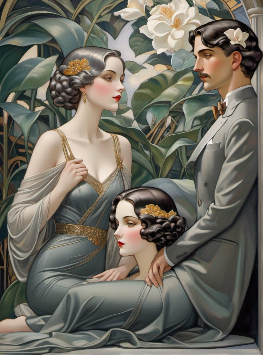 An art deco style painting of an elegant couple, the woman in a flowing dress, man in a suit, amidst lush foliage.