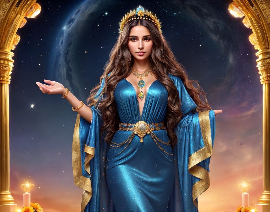 goddess woman of flower magic, priestess of the light, long wavy brown hair, human face, 30 years old, high definition, fine details, spanish looking, most beautiful face in the universe, full figure, long flowing blue gown, hands held out wide, gold scarab beetle necklace, surrounded by flowers, flower crown, emanating pure love and beauty, standing in temple, portrait frame