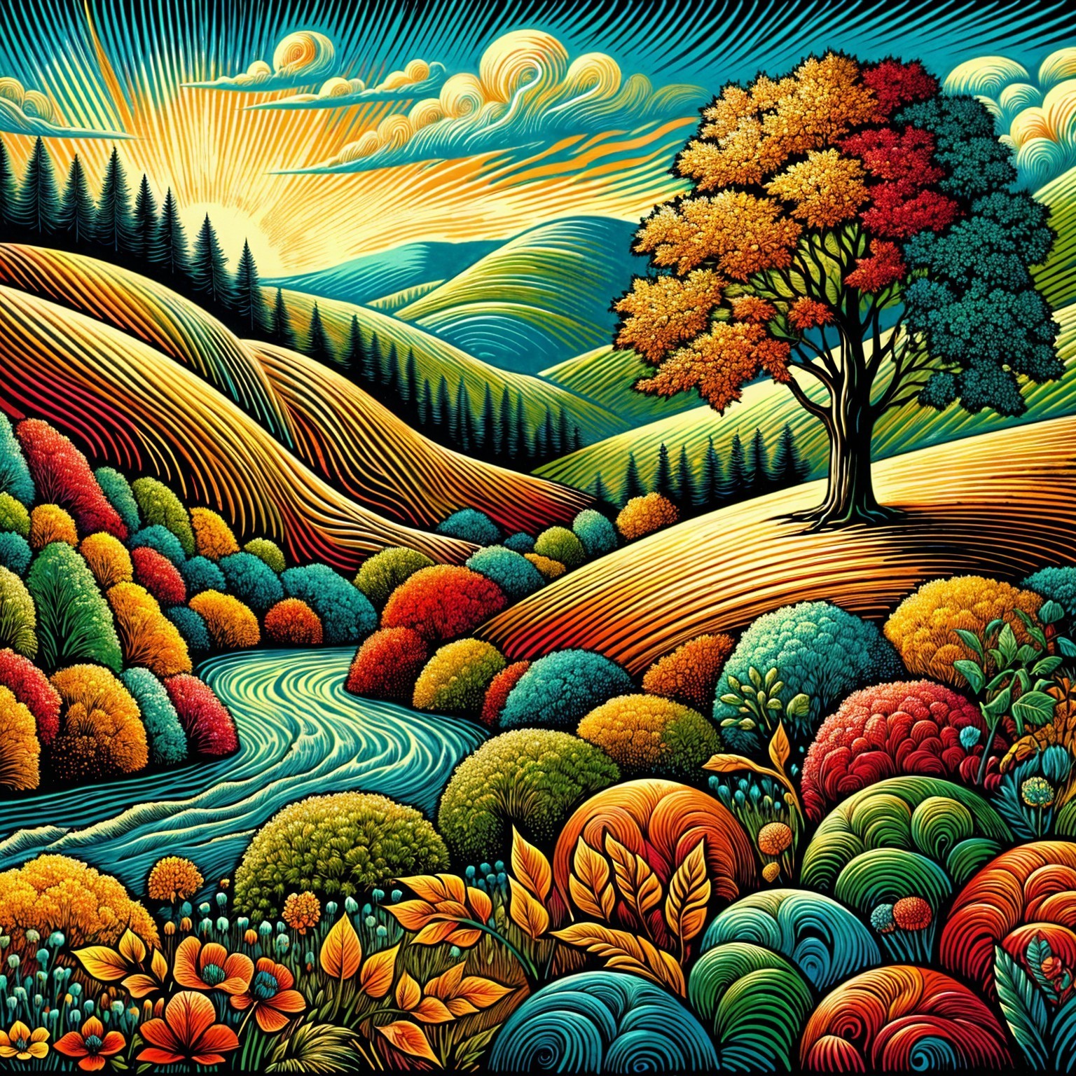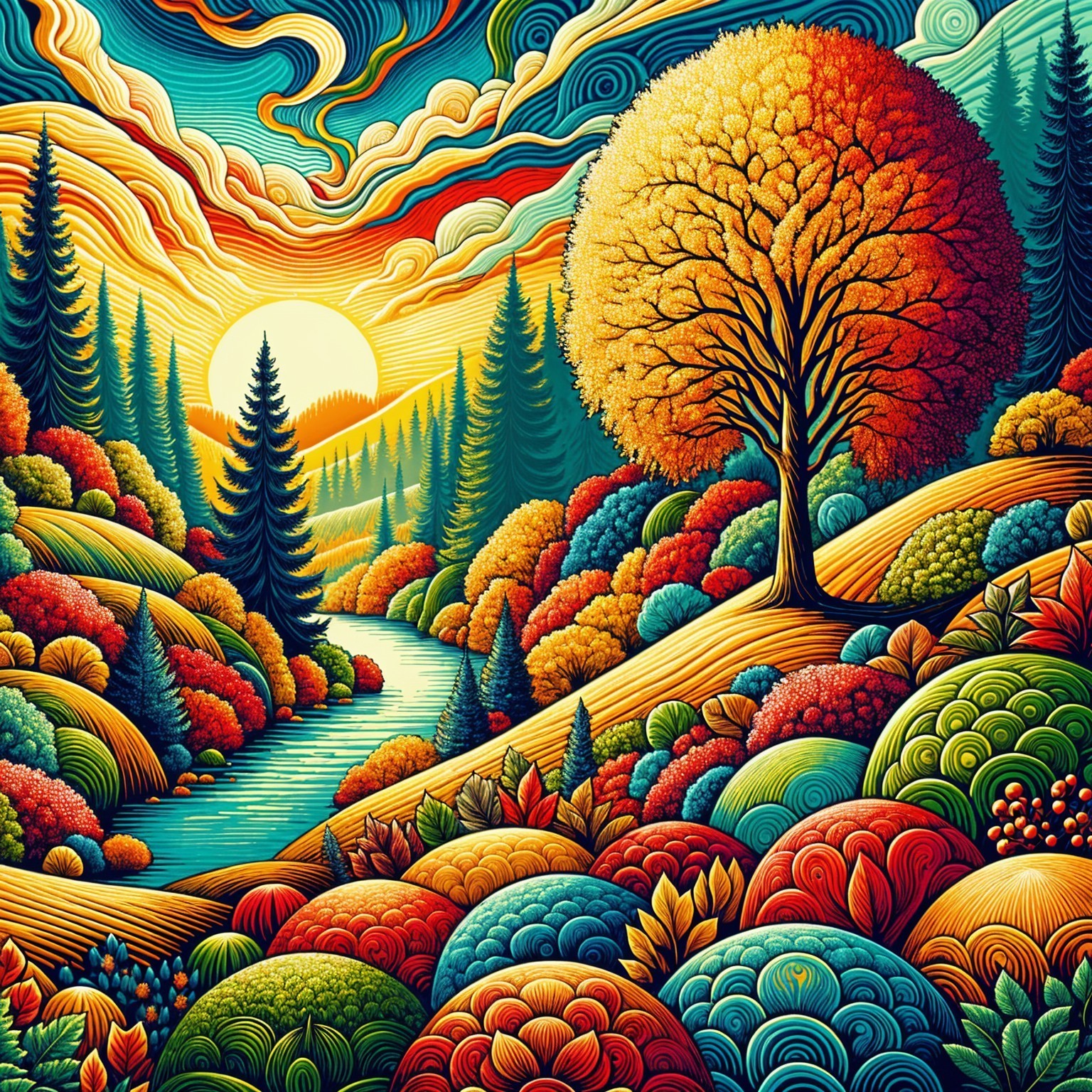 A vibrant landscape featuring a sunset over rolling hills adorned with autumn foliage. Trees, colorful bushes, and a reflective lake create a harmonious and dynamic natural scene.