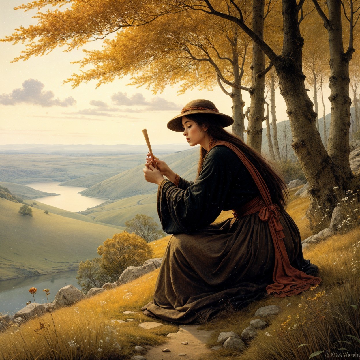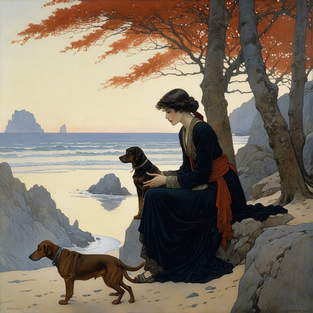 A serene scene depicting a woman in a flowing dress sitting by the sea, accompanied by two dogs. She gazes thoughtfully at the waves, with cliffs and a distant rock formation in the background.