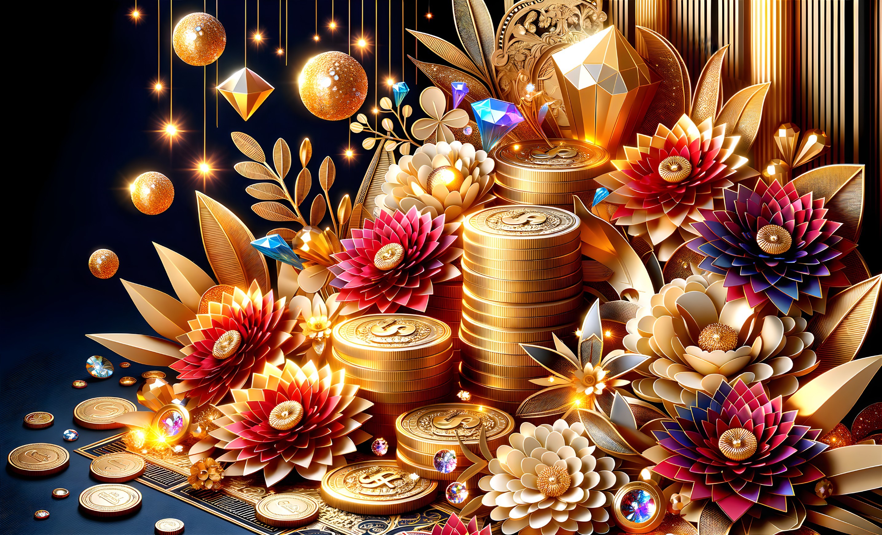 A vibrant arrangement of gold coins, colorful flowers, and jewels on a dark background, exuding wealth and prosperity.