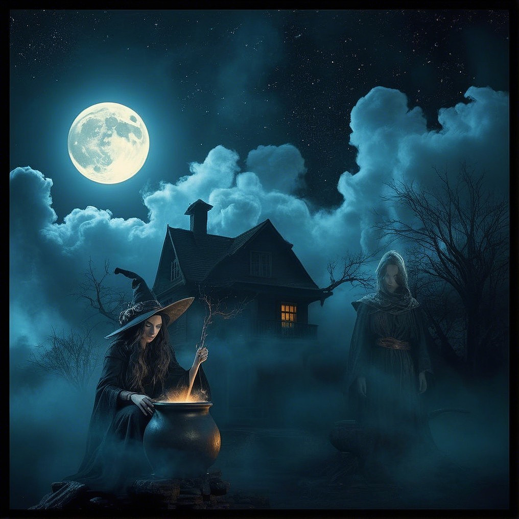 A witch in a pointed hat stirs a cauldron under a full moon, surrounded by mist. In the background, a mysterious figure stands near an eerie, dimly lit house amid swirling clouds.