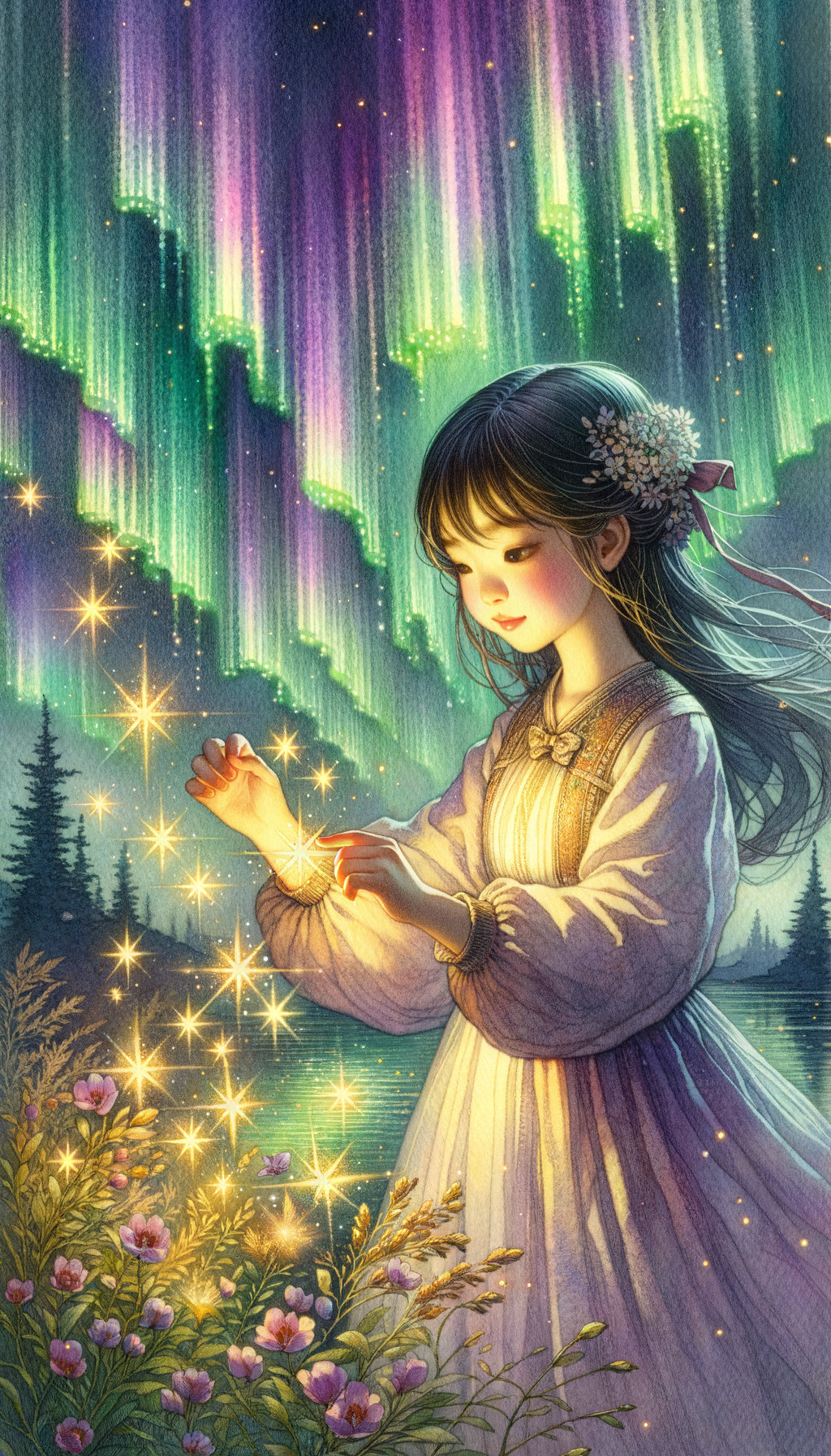 Prompt: The stars collector, under the northern lights. Delicate watercolor illustration, of a young lady collecting fallen glowing golden stars, whimsical, beautiful, poignant, touching. Jean Baptiste monge, josef kote, Daniel Merriam