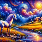 A vibrant unicorn stands by a shimmering lake, surrounded by colorful swirling skies and majestic mountains. The scene is filled with vivid hues, reflecting magic and fantasy.