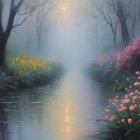 A serene, misty landscape features a tranquil stream flanked by vibrant blooming flowers in shades of pink, yellow, and blue, reflecting soft light amidst bare trees.