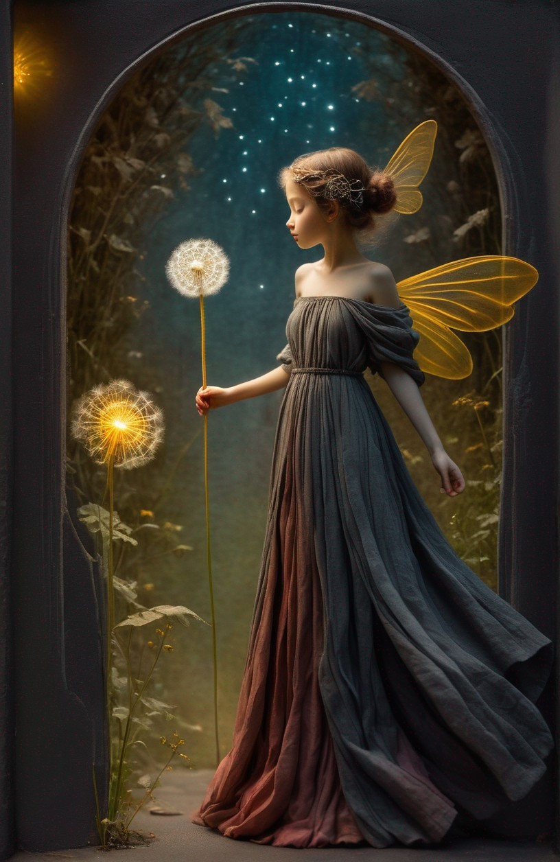 A girl dressed as a fairy with translucent wings holds a dandelion seed head, contemplating it in a warm, moody light.
