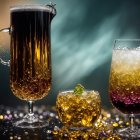 In a dramatic mountain landscape at dusk, two glasses of golden beer, one tall and frosty, rest on a rocky ledge. Dark, jagged peaks rise majestically, creating a stunning backdrop.