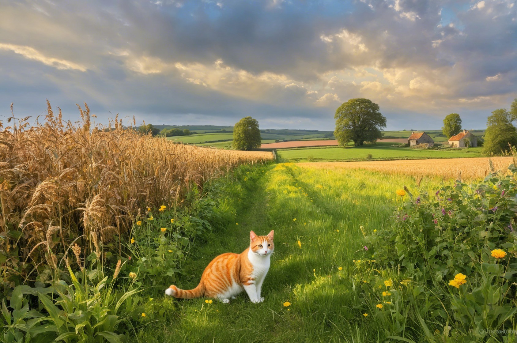 A vibrant landscape features a ginger cat standing on a sunlit path, surrounded by colorful flowers, with rolling fields and quaint cottages in the background under a bright blue sky.