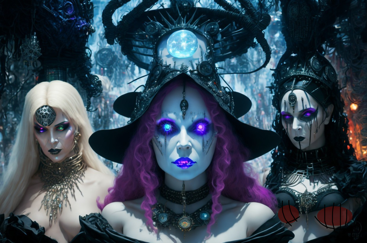 Three gothic women with striking makeup and mystical attire stand in a foreboding forest setting.