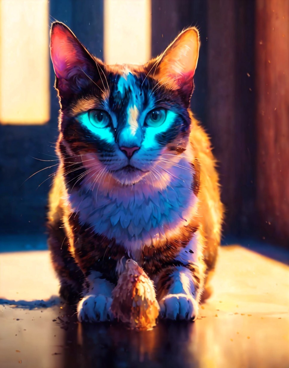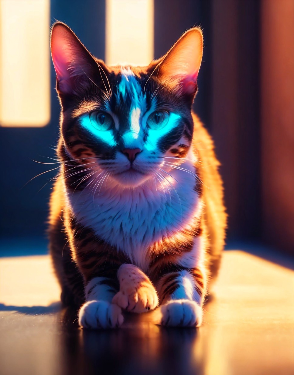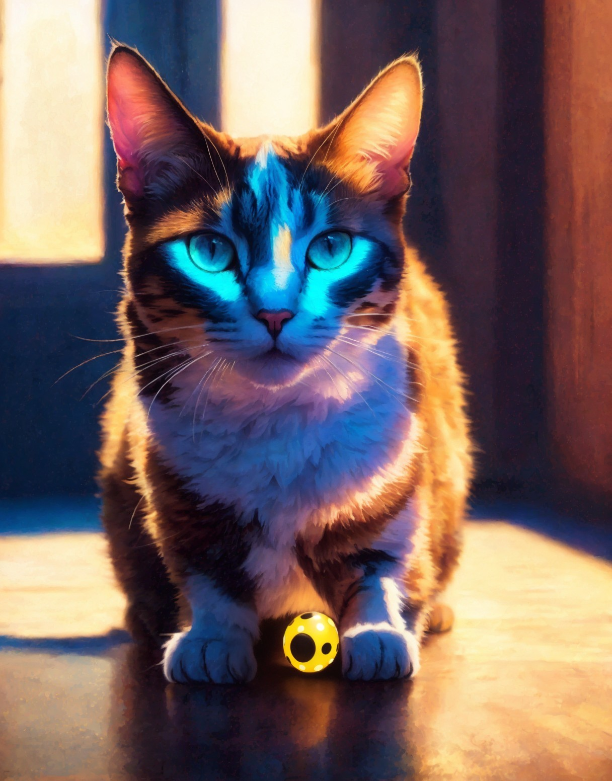 A vibrant, artistic depiction of a cat with striking blue eyes, basking in sunlight by a window, accompanied by a small yellow toy.