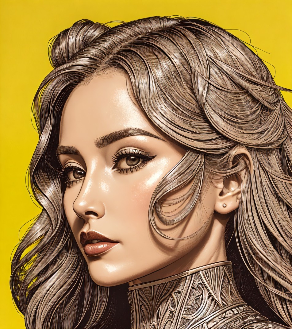 Portraiture of beautiful female empress, sculpted, crisp headshot, auracore, high stylized lineage illustration, tints of linocut, hues, grain, blurry aura, auracore 1.7, synthetic, Anglocore 1.9, retrofuturistic details, surreal, style of Margaret Keane, intricate details, stylized hairdo, ethereal, abstract, grunge, acid spill, embossed strokes,