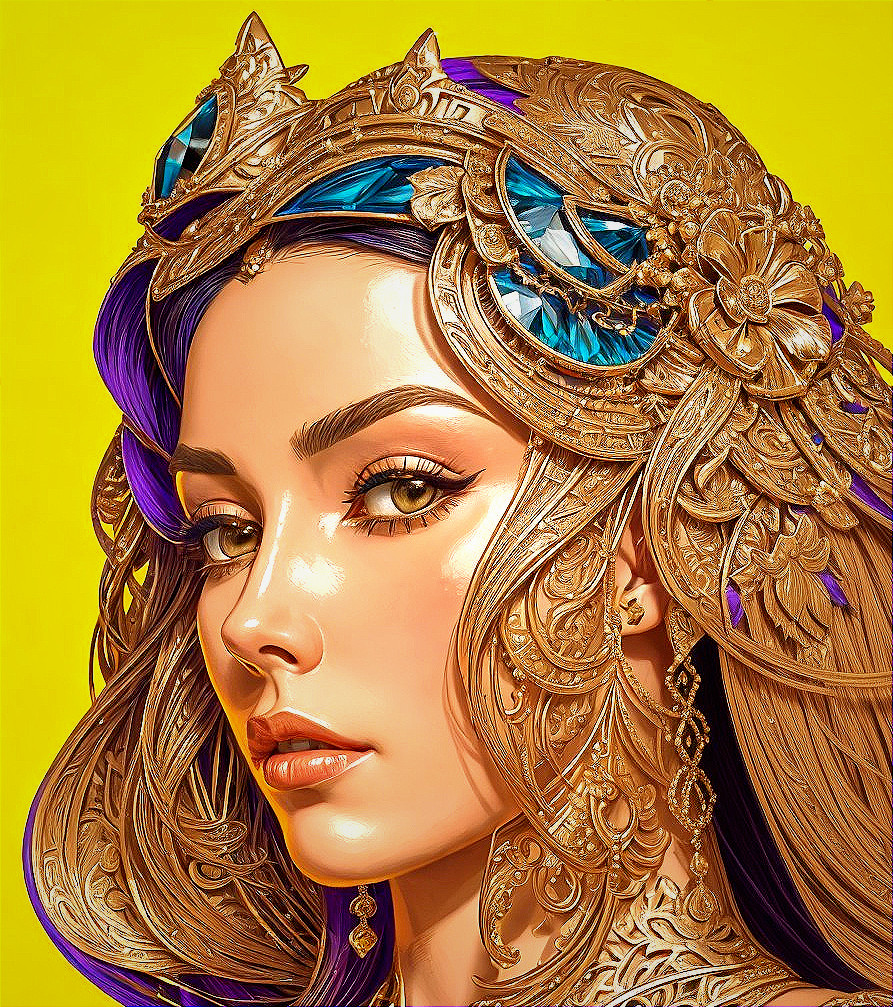 Portraiture of beautiful female empress, sculpted, crisp, headshot,, comic book art 1.2, strict, stylized lineage illustration, tints of linocut, hues, aura, auracore 1.7, synthetic, american gothic 1.9, retrofuturistic details, biomorphic, style of Margaret Keane, intricate details, stylized hairdo, ethereal, abstract, acid spill, embossed strokes, tints of 1970s advertising art, intricate Science-fiction details, vibrant colors, fauvistic cuts, vector art, detailed ornamental features, headset with technical details, antennas, screws,wires, electrical components, erectors, golden wires, circuits, highly detailed strokes, tints of space age style, layered geometrical vector art