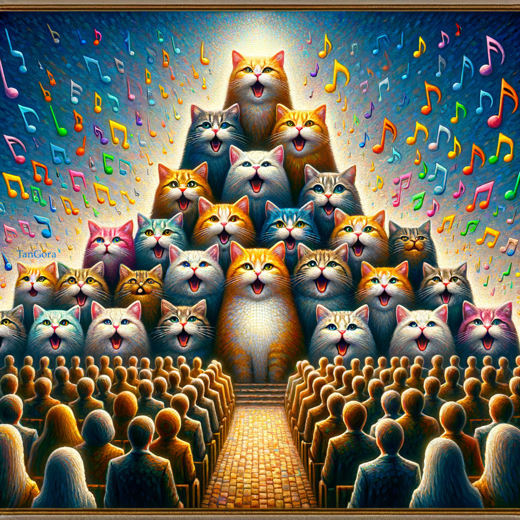 A whimsical scene of a choir of cats, each with unique expressions, singing joyfully on a colorfully decorated stage, while an audience of people watches in delight. Musical notes fill the air.