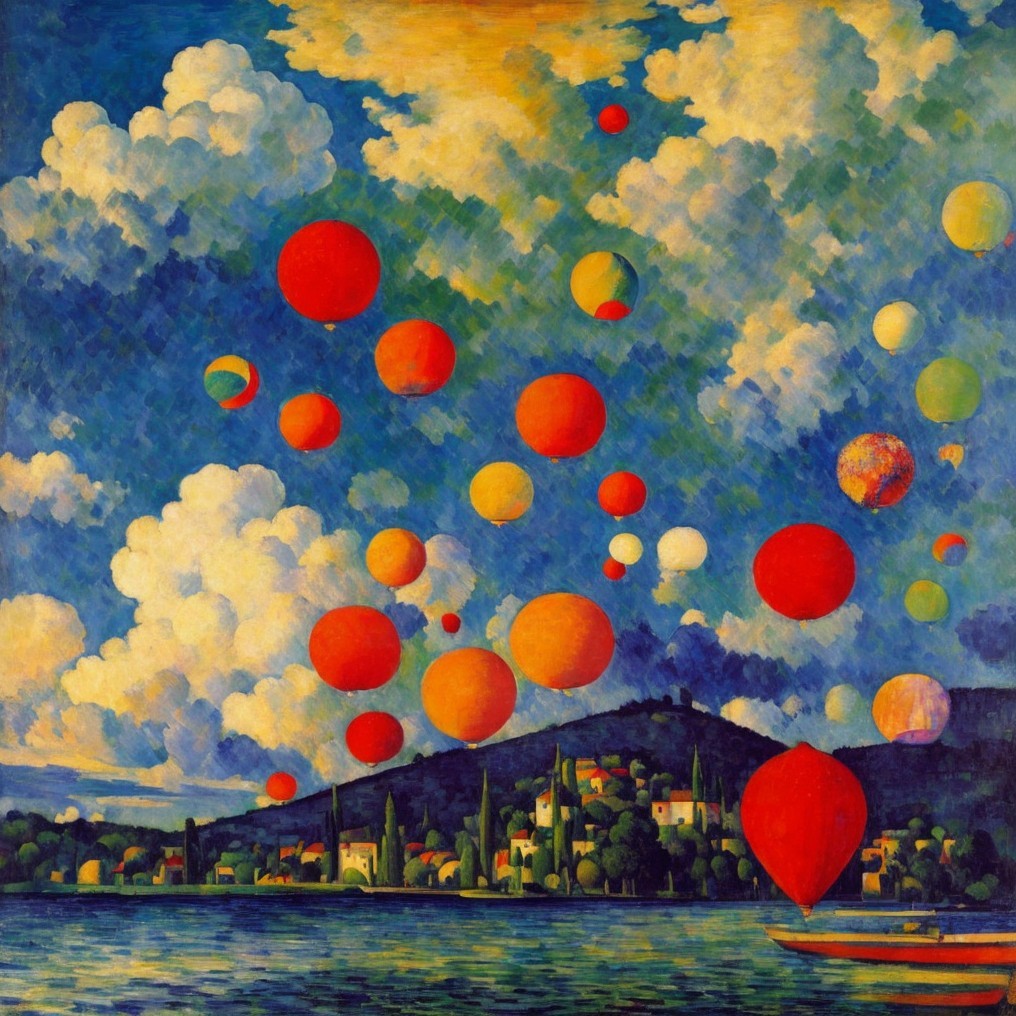 Dramatic sunset painting with cumulus clouds over tumultuous ocean