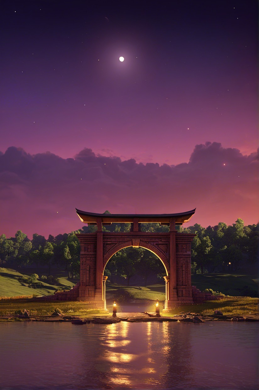 A serene, otherworldly landscape features a magnificent archway reflecting in calm waters. Two moons hover in a twilight sky filled with colorful clouds, creating a dreamlike atmosphere.