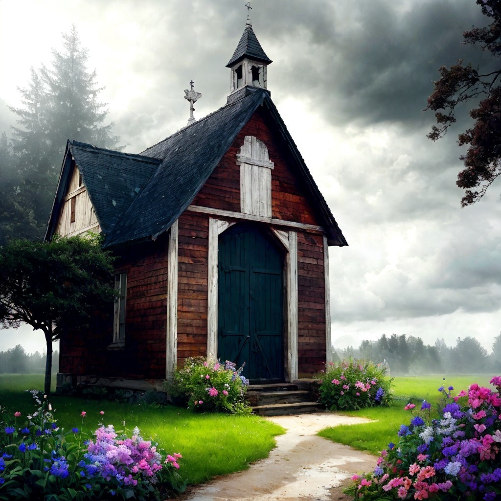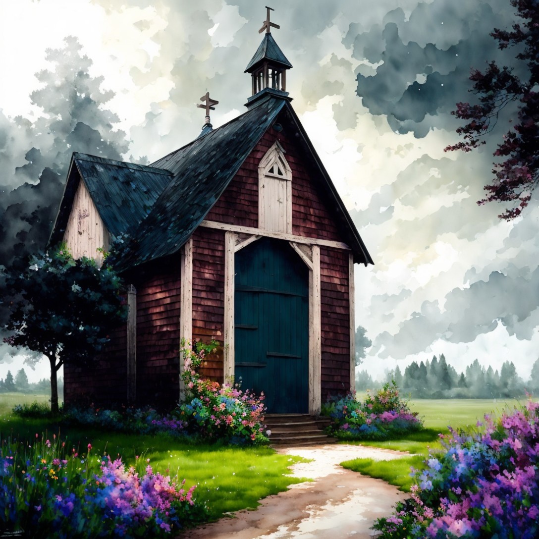 Prompt: "Mineral painting line art, bleached old wooden chapel in between trees, flower gardens, In the sky stormy clouds are approaching, the sun shines through the clouds, midday mood. Balanced composition. Wet on wet watercolor and heavy ink. Dynamic lighting, crisp quality, in the style of Thomas Wells Schaller and of Sophia Elliot