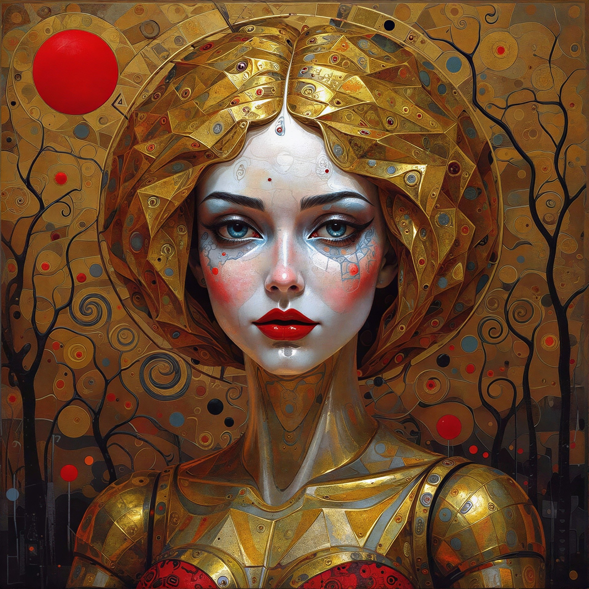 A striking artistic portrait of a woman, resembling a painting by Gustav Klimt, fills the frame. Her face, light-skinned with a rosy blush on her cheeks, is adorned with elaborate tribal geometric patterns in red and blue. The woman's lips are a vivid red, and her bright blue