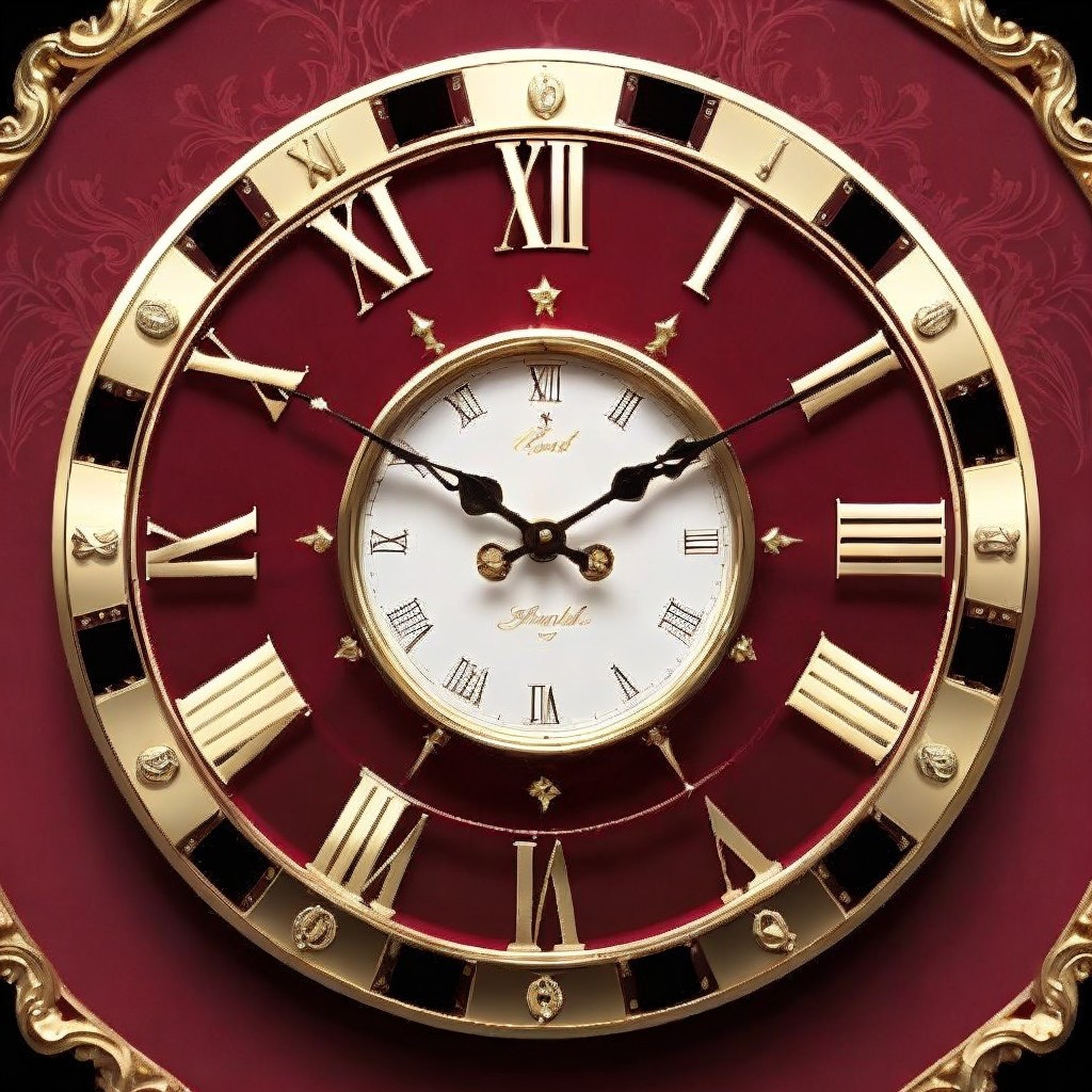 A sophisticated wall clock with a rich red background features gold accents and intricate detailing. It has Roman numeral hour markers and elegant clock hands, exuding classic charm.