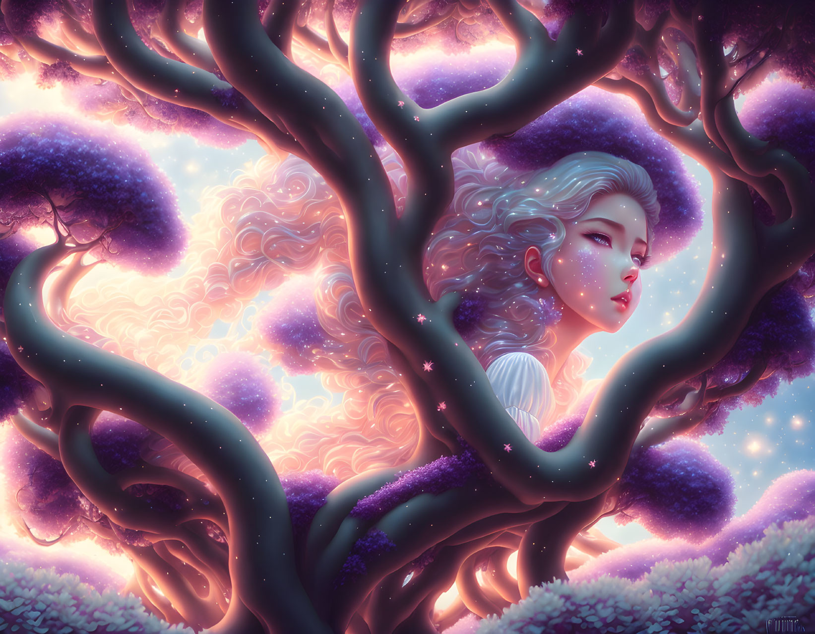 a pretty girl dreaming in the dream world falling from a magic white tree, floating in the sky between the ground and the sky; she has ultra detailed beautiful face, and extremely detailed big hazel eyes; wearing a cute dress; Art style: Hajime Sorayama fantasy art