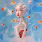 A dreamlike portrait of a pale-skinned figure surrounded by colorful fish and soft floral elements, exuding a serene, whimsical atmosphere with vibrant colors and ethereal beauty.