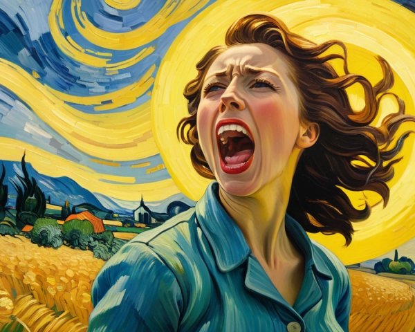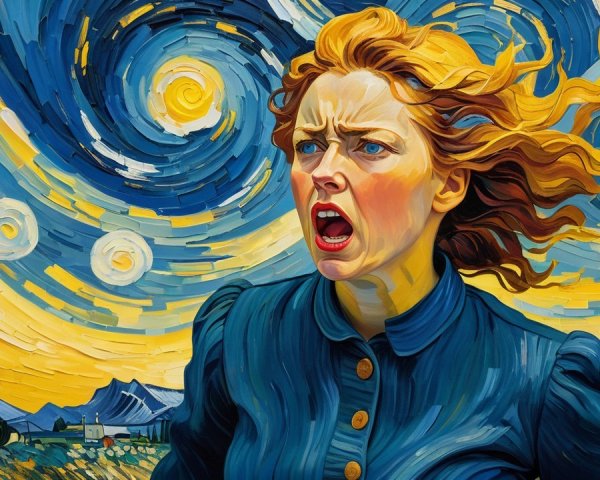 The image features a swirling night sky filled with bright stars, painted in vivid blues and yellows. Below, dark mountain silhouettes rise against the horizon, with vibrant autumn trees in the foreground.