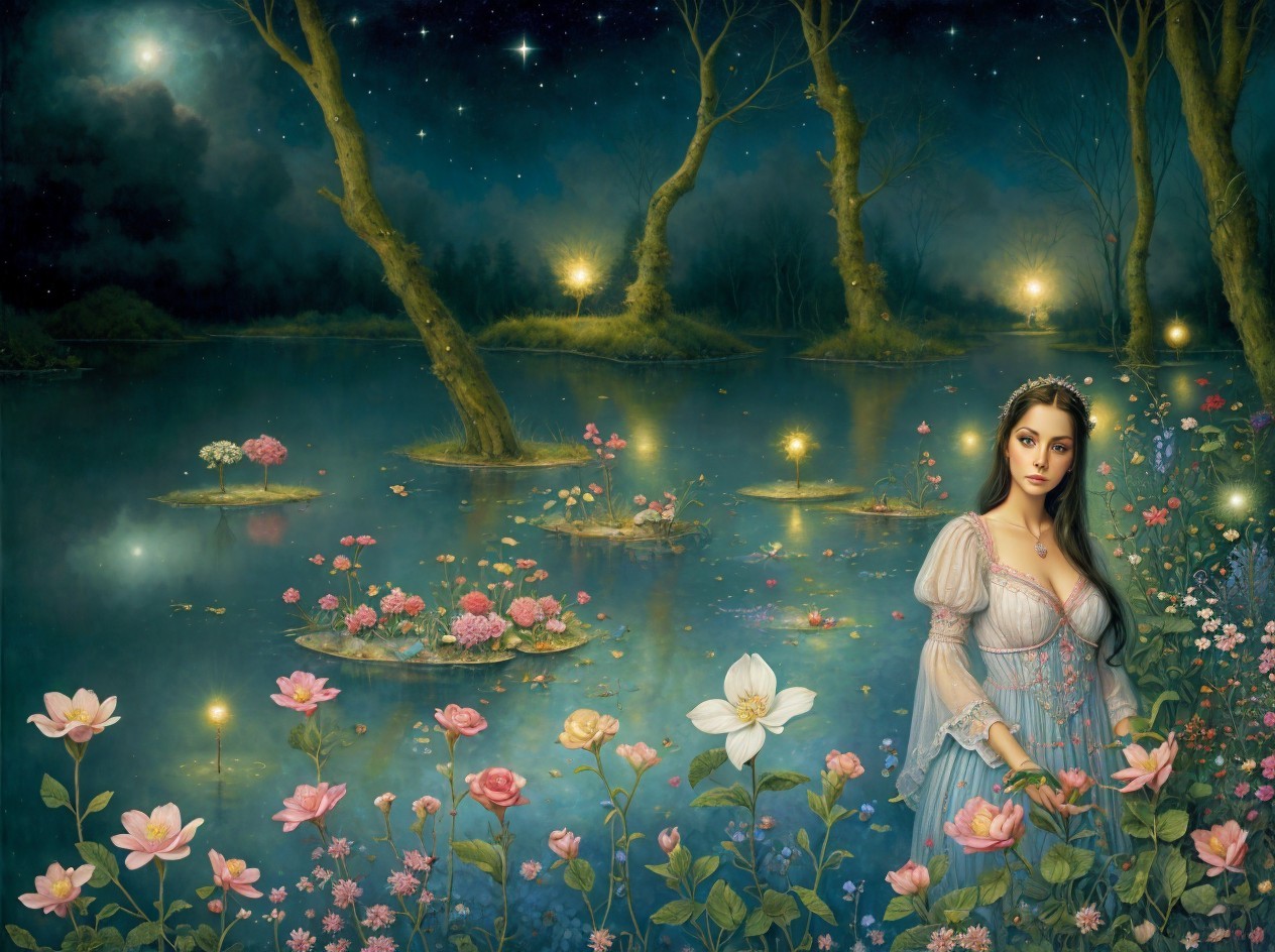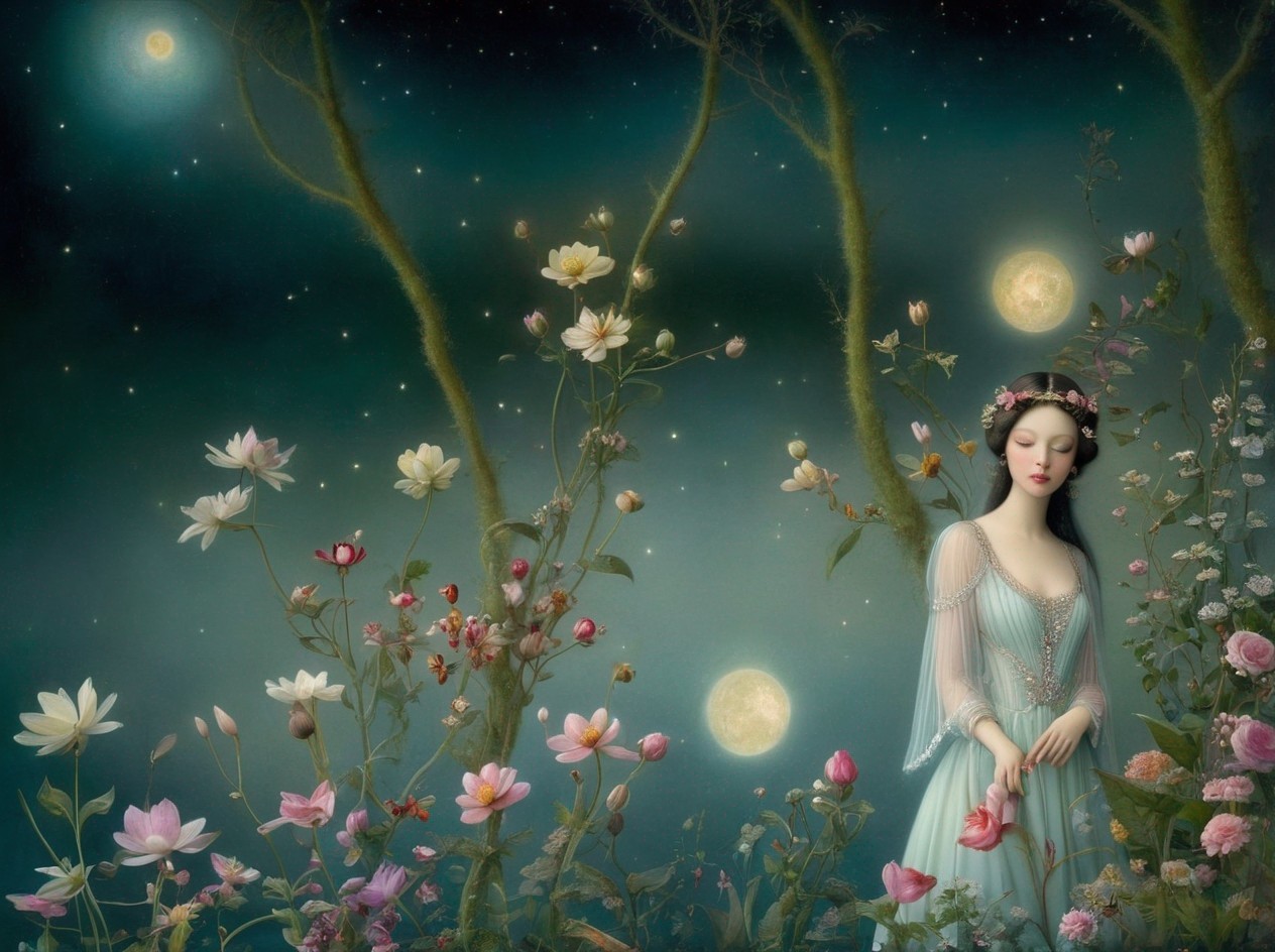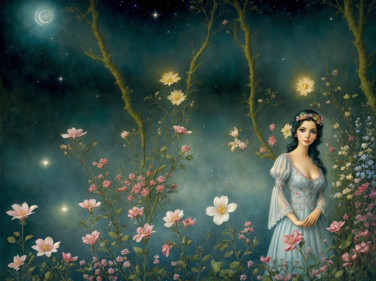 A serene woman in a blue gown sits among blooming flowers under a starry night sky with a bright moon above.