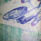 The image features a futuristic spaceship design with sleek lines and a mix of blue and silver tones. It showcases intricate details, including engines and a unique structure set against a starry backdrop.