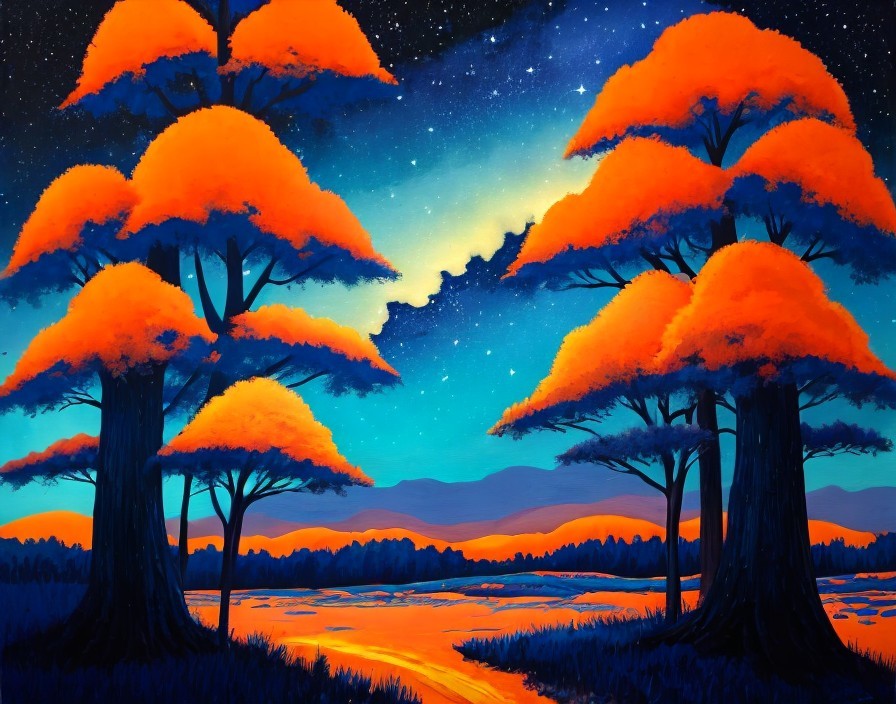 Surreal Landscape with Luminous Orange Mushrooms