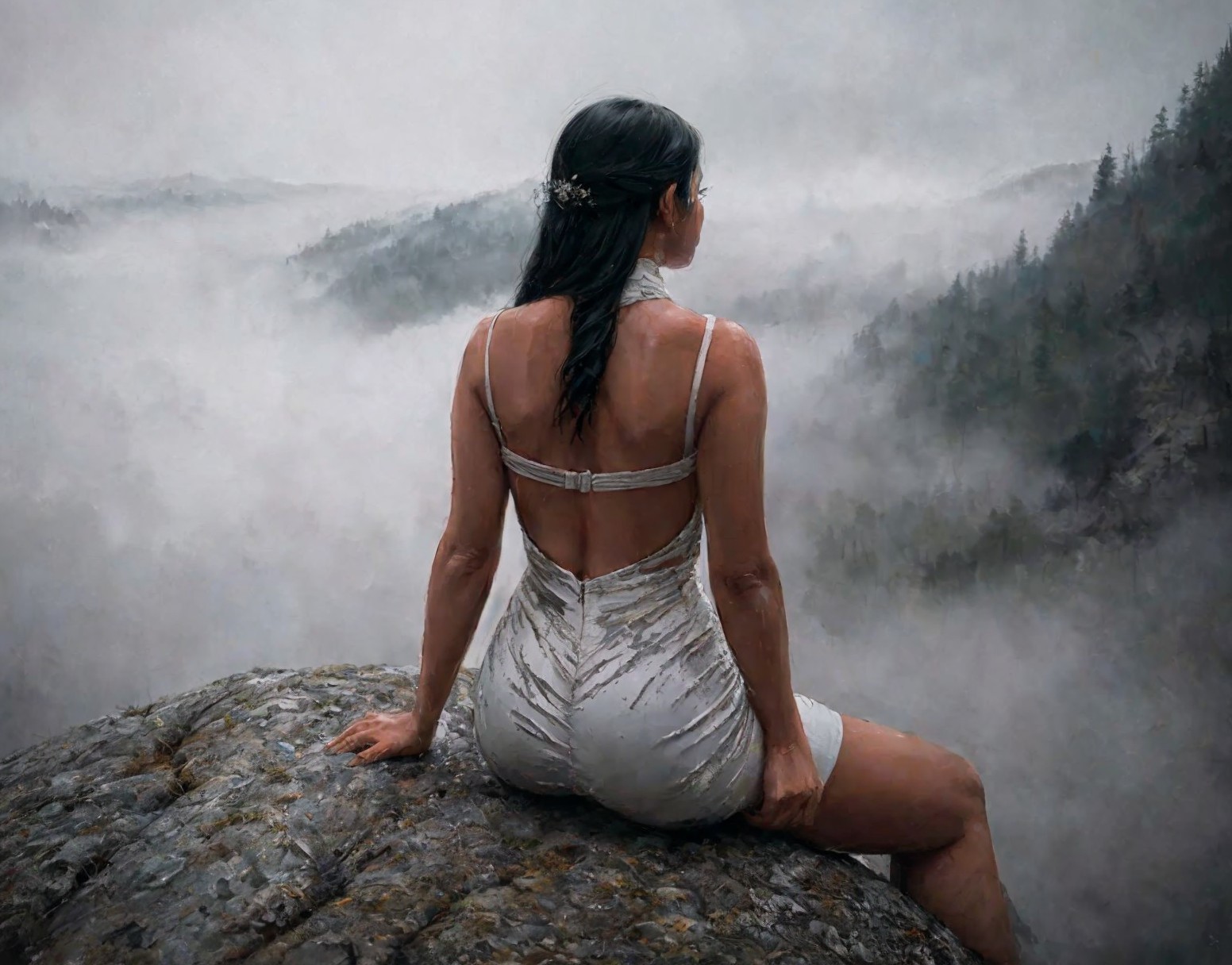 A woman sits on a rock, her back to the viewer, overlooking a misty, mountainous landscape.