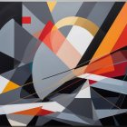 An abstract artwork featuring bold geometric shapes in gray, black, red, and yellow, centering on a sleek, stylized car silhouette, evoking speed and dynamic motion.