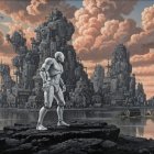 A futuristic landscape features a sleek robot and a rider on horseback gazing at towering structures against a backdrop of clouds and a serene lake, merging nature with advanced technology.