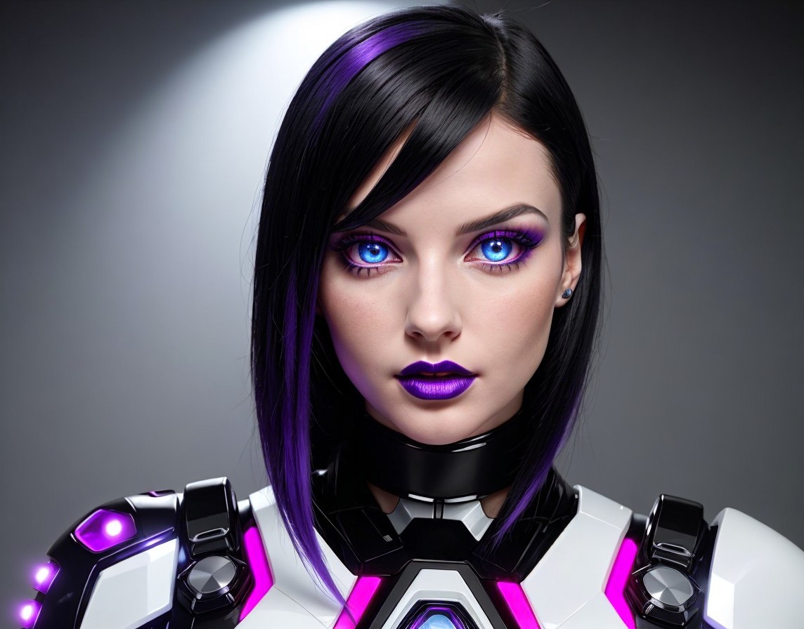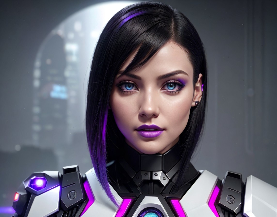 Futuristic woman with bob haircut, violet eyes, and high-tech armor, against a neon-lit cityscape and crescent moon.