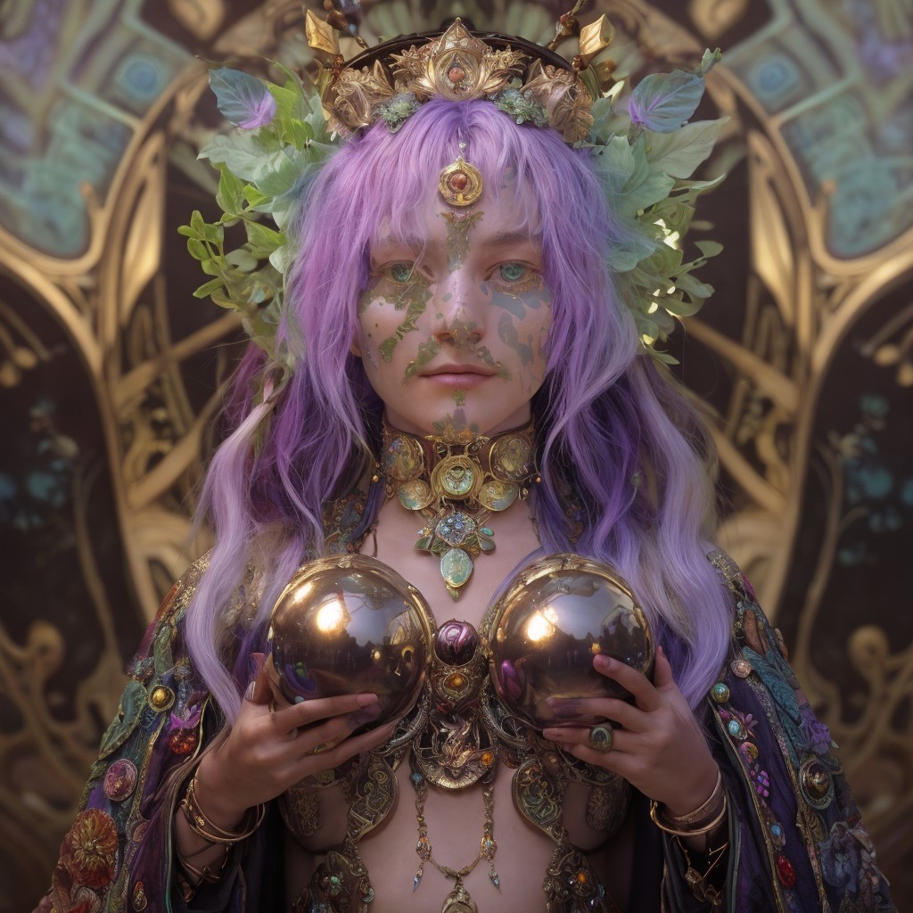 A regal fantasy figure with purple hair, a golden crown, and intricate jewelry holds two spheres against a mechanical backdrop.