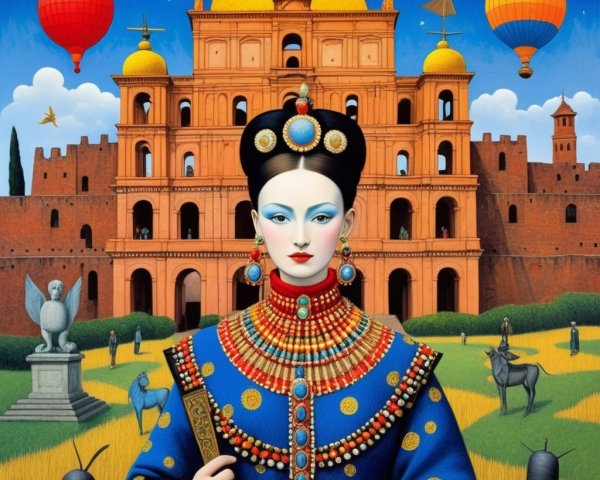 A young girl stands at a vibrant, candy-themed doorway, overlooking a coastal view. Colorful lollipops adorn the entrance, blending fantasy with adventure in a whimsical landscape.